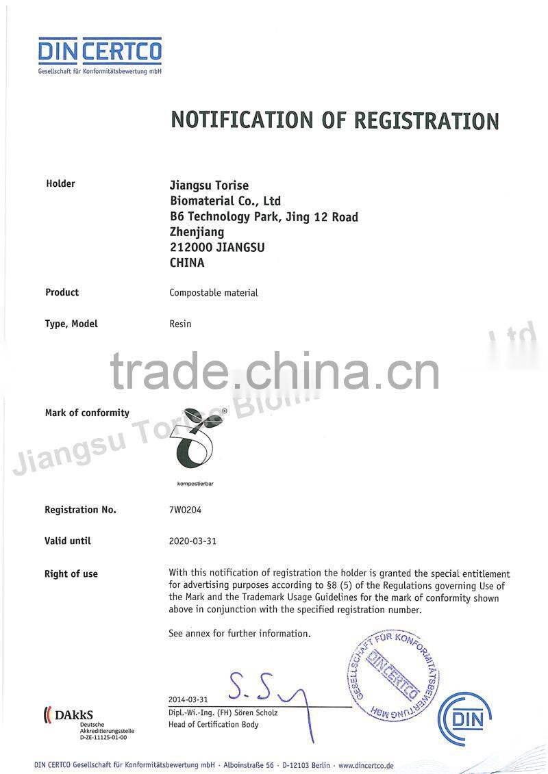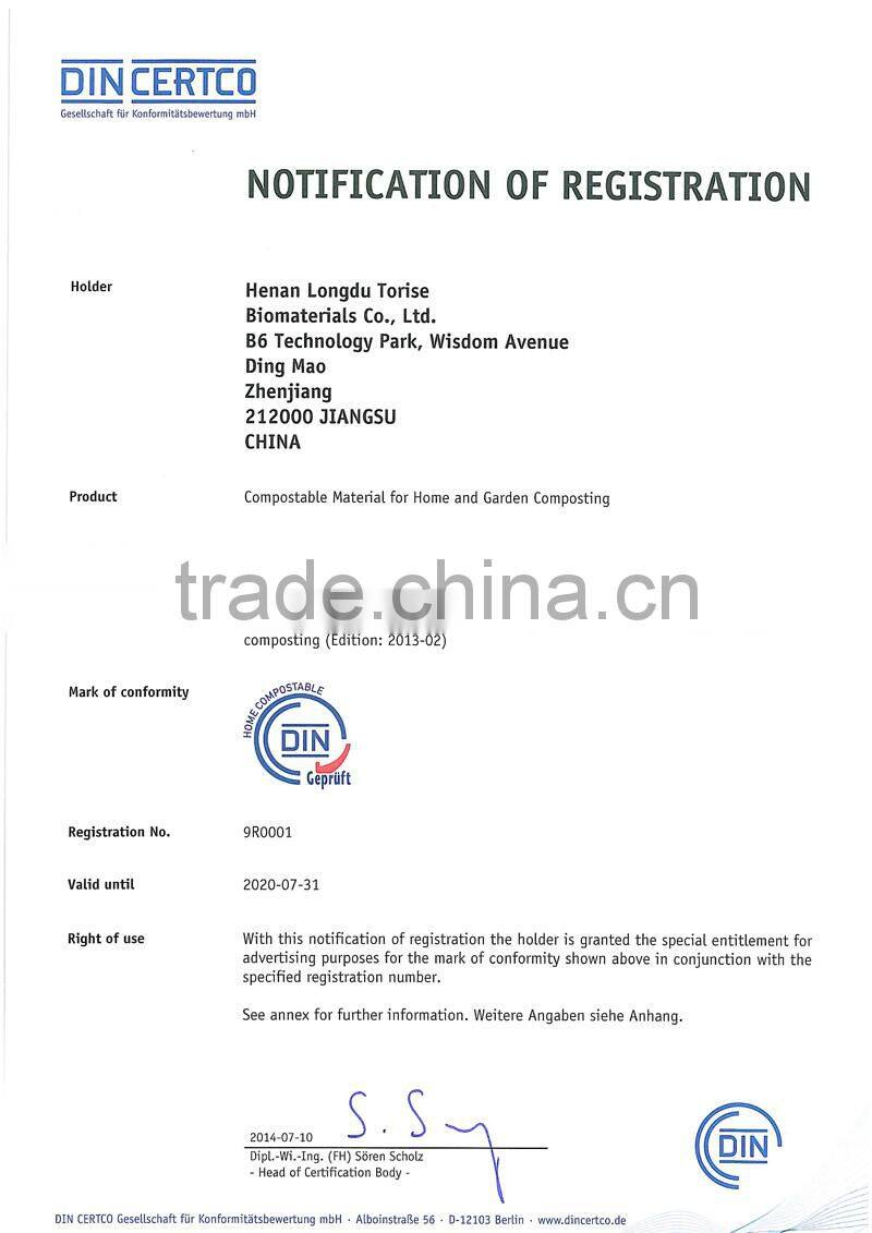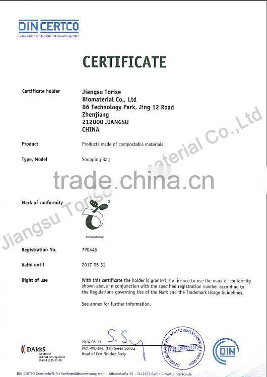 Jiangsu torise Biomaterials Co., Ltd is a world leader in providing 100% biodegradable materials, bags and films for the collection of organic waste for the purpose of composting. We have the whole production line from the materials to finished products. Unlike regular plastic, Torise brand products are made from a resin derived from plant starches, vegetable oils & compostable polymers and can be consumed by micro-organisms that live in our soils. Because of this, our materials,films and bags can also be readily composted along with organic waste in municipal composting facilities. We are fully committed to ONLY producing certified compostable materials, bags and films.